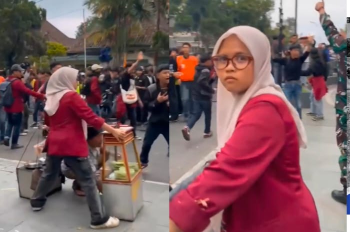 Mahasiswi Berhijab Pasang Badan Lindungi Pedagang Kue Ape di Tengah Ricuh Aksi Sukabumi